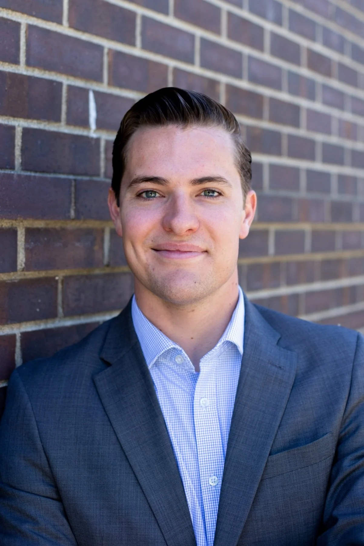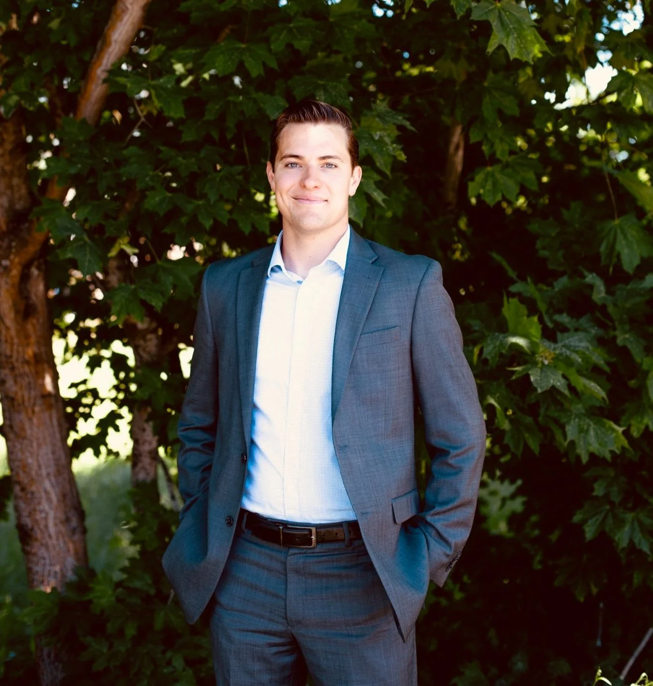 A young man wearing a gray suit and white shirt, standing outdoors with trees and greenery in the background.